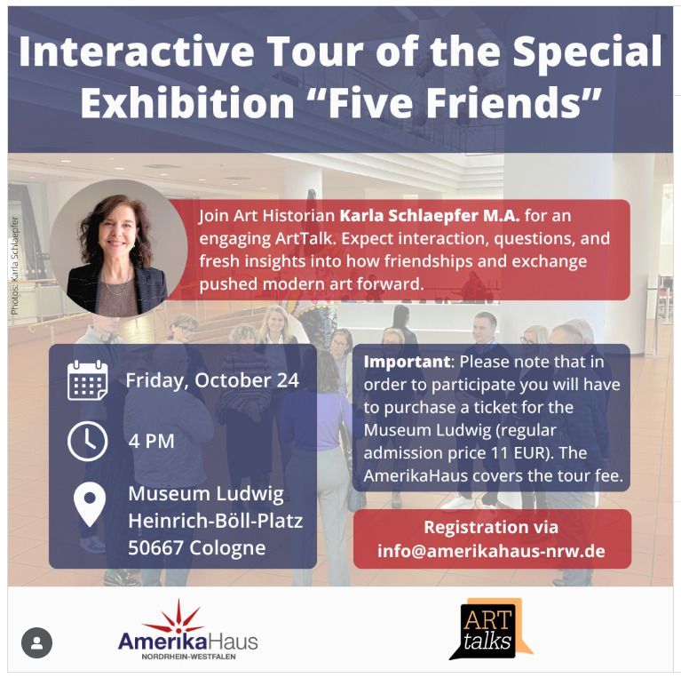 Join Art Historian Karla Schlaepfer M.A. for an engaging ArtTalk in the special exhibition “Five Friends” at Museum Ludwig. Expect interaction, questions, and fresh insights into how friendships and exchange pushed modern art forward.